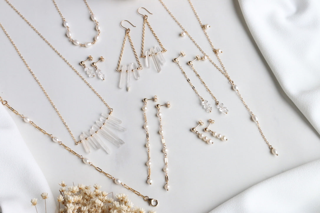 The Timeless Collection features freshwater pearls and Herkimer diamonds, with dainty chains...